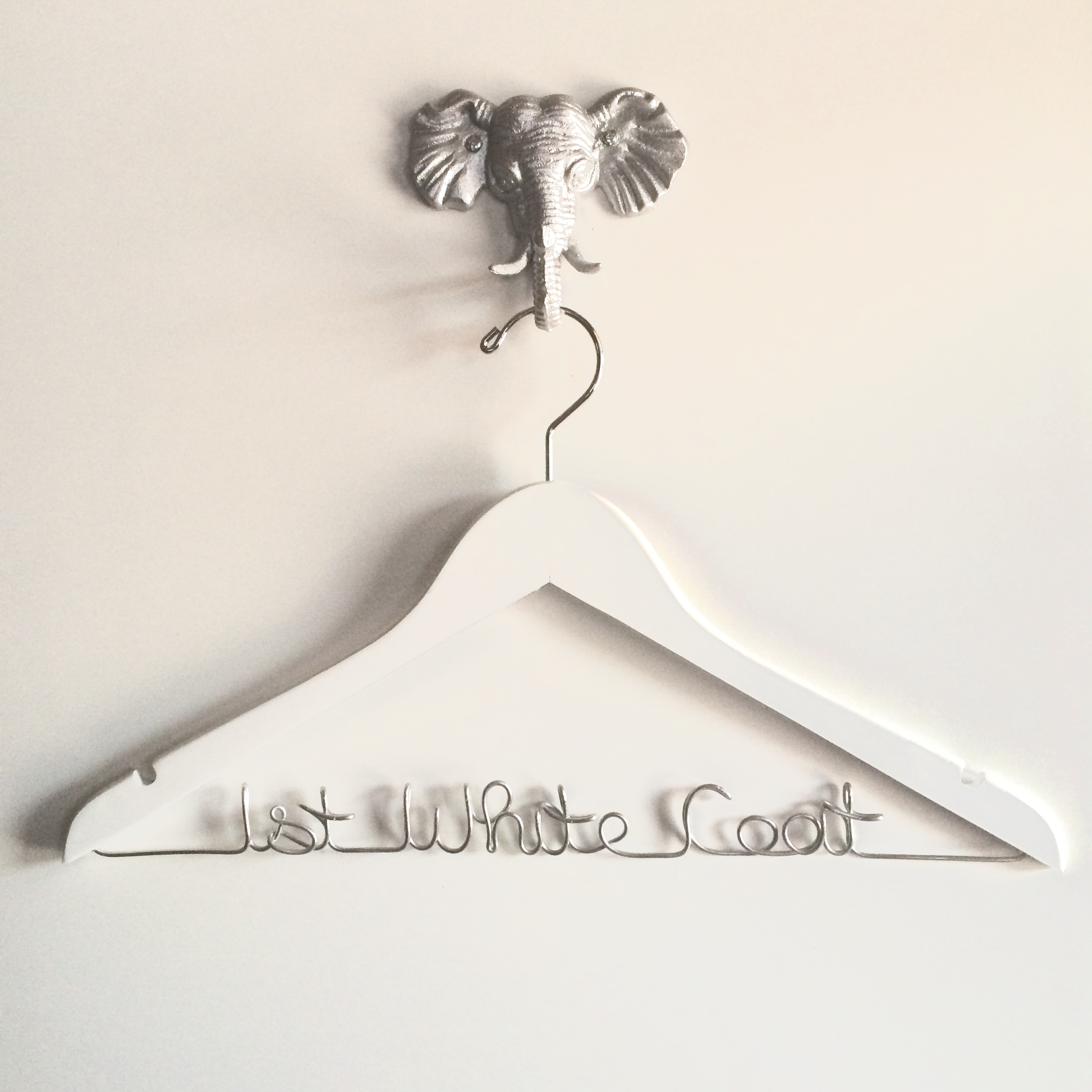Hangers are available in black, walnut, white or natural wood. Please make your choice from the drop down menu and include the name you would like in the box provided at checkout. There is a maximum of 18 characters – spaces and periods count as 1 character each. If the name exceeds the limit, please contact me at handcraftedaffairs [!at] gmail.com and I will let you know if the longer name is possible!
